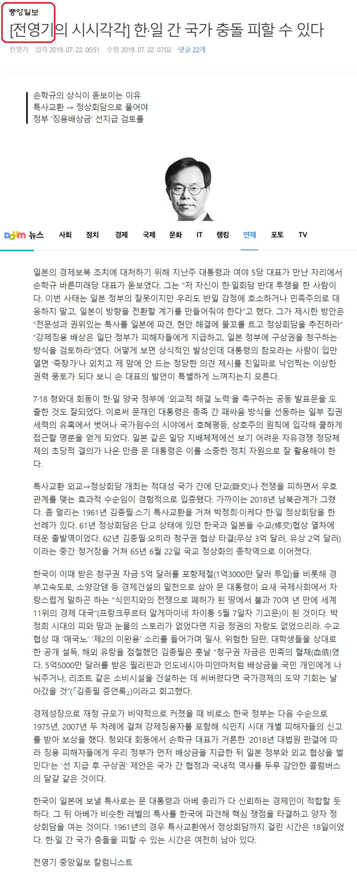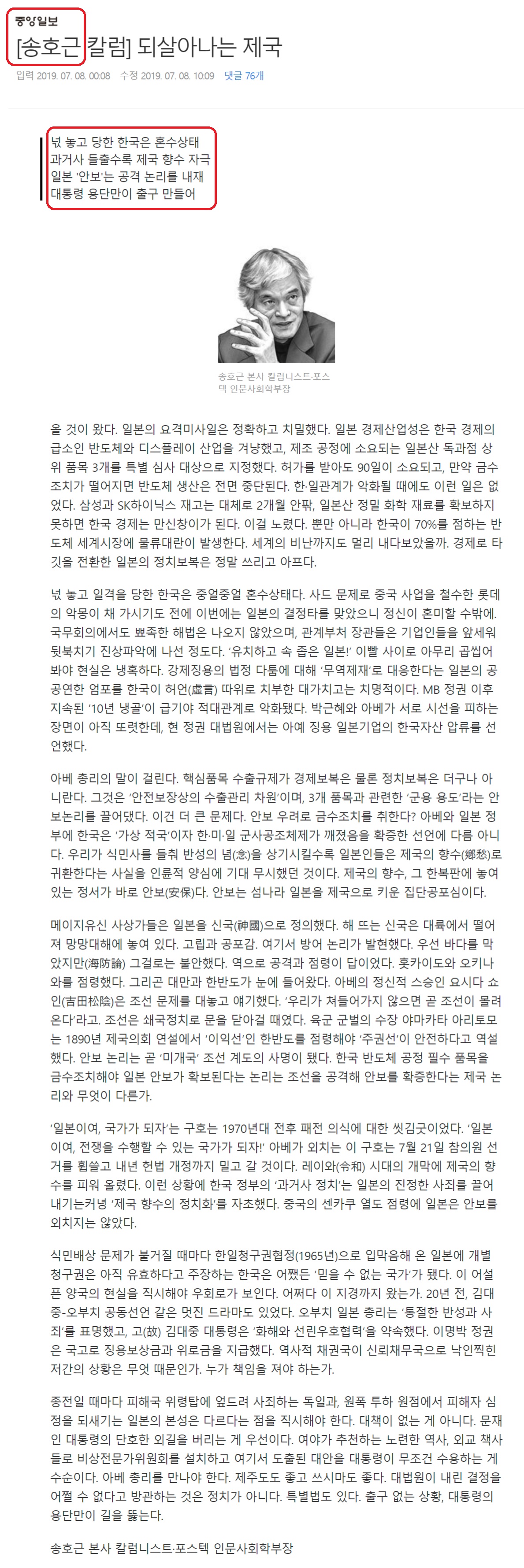 일본의 무역 행패 때 중앙일보 칼럼